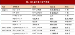 默克公司的绒促卵泡素α注射剂(商品名elonva)于2010年在欧洲上市,这是目前唯一一款获批的ctp融合蛋白药物,与常用重组卵泡刺激素(rfsh)药效学一致,将早期1天1次的注射频率降低至1周1次,估计2016年销售额接近2.5亿美元。国内信立泰子公司成都金凯的重组人促卵泡激素-ctp融合蛋白于今年4月申报临床,目前处于审评审批中。全球其他在研产品中进度较快的生长激素ctp融合蛋白处于iii期临床阶段,由opko与辉瑞合作开収。