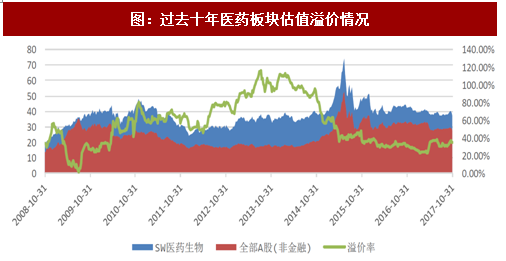 截至2017年10月31日,医药板块整体估值为37.09倍,在28个一级行业中处于中等偏上的水平。医药板块相对于全部a股(非金融)估值溢价率为34.63%,低于过去十年间56.06%的历史均值,而且处于2010年5月以来的低位水平,估值溢价风险相对较低,具有一定的安全边际。随着大盘估值中枢的整体上移,医药板块将逐步具备吸引力,既有政策支持,又有业绩支撑的优质个股将迎来较好的投资机会。