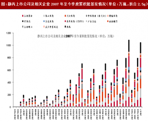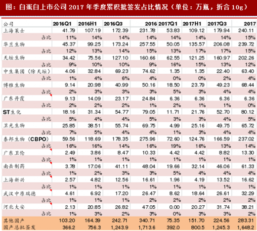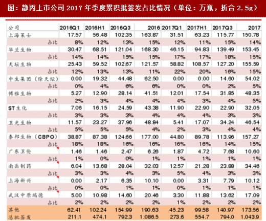 2017年全年批签发1043.9万瓶(折合2.5g),2016年全年批签发量为1041.98万瓶,2017年同比下滑3.92%。