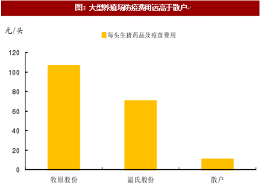因此,规模养殖场的疫病风险明显高于散户,其对防疫的重视程度也远高于散户。以生猪养殖行业标杆性企业温氏、牧原为例,温氏在每头生猪上花费的兽药和疫苗成本为70元,牧原更是高达106元,而散户一般不超过10元。这也使得动物保健行业呈现明显的“二八现象”,占比20%的大型养殖场可以贡献约80%的收入和利润。