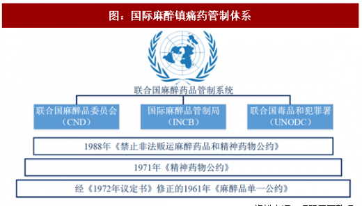 以麻药为例,由于麻醉镇痛药的成瘾性,国际上对这类药物实行了严格的管制,主要由联合国下属的麻醉镇痛药委员会(cnd)、国际麻醉镇痛药管制局(incb)及毒品和犯罪署(unodc)在国际范围协调麻醉药品管制活动。其中国际麻醉镇痛药管制局分析180多个缔约国政府提供的统计报告,对各国的生产、制造和各主要阶段的药物数据进行评估监测。同时麻管局还通过对政府官员进行培训、与各国政府对话和评价等方式,促进政府履行各项国际药物管制公约的规定。