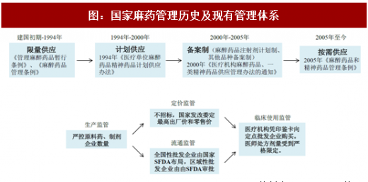 我国在建国初期直至八十年代,由于对麻醉镇痛药认识不足和新药品种的缺乏,过于强调麻醉镇痛药的成瘾性,导致麻醉镇痛药的使用收到了严格管制。1985年我国批准成为《麻醉镇痛药单一公约》缔约国,在国际组织的帮助下逐渐对麻醉镇痛药有了全面认识,并且随着我国卫生条件的改善、药物品种的增加和癌性镇痛等镇痛药物需求的加大而逐步合理放开,以满足临床的合理使用。