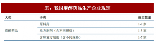 在合理放开的同时,国家对生产、流通等环节均有严格规定。2005年国家食品药品管理局对麻醉镇痛药生产企业数量进行了严格限制,客观提高了行业进入壁垒。流通环节也受严格管控:麻醉药品和第一类精神药品全国性定点批发企业牌照由国家食品药品监督管理局规定,目前我国仅有国药股份、上海医药和重庆医药三家,区域性批发企业预计在500家以上。