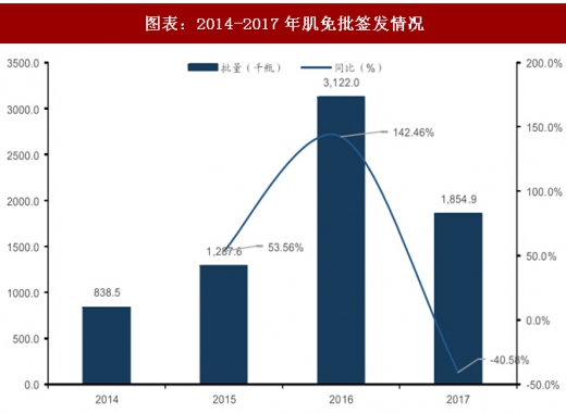 肌免2017年估计市场2亿。根据批量以及单价100元的假设,估计2017年市场约为2亿,仍是一个较小的市场。