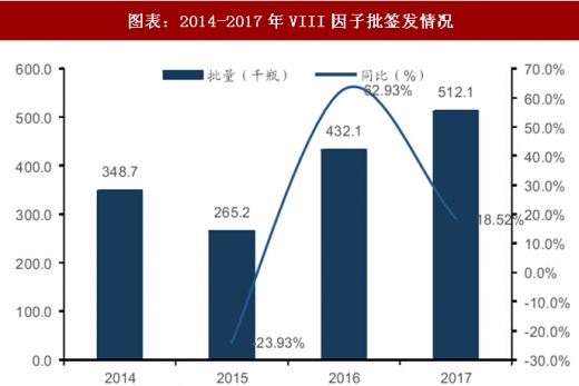 viii因子在17年批签发量增速稍有放缓,但仍保持在24%的增速。根据批量以及单价估计,2017年viii因子市场约为6亿,预计未来还有较大上涨空间。
