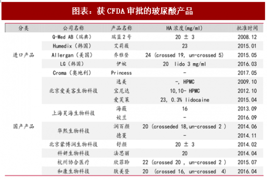 在全球所有的注射类美容中玻尿酸仅仅排于肉毒毒素之后,占到了所有非手术类疗程数的 25.5%。在日本、意大利、法国等国家,玻尿酸的注射次数已经超过了肉毒毒素的数量。j.p.morgan 投行部执行董事吴军预测,在 2019 年中国微整形市场将达到市场总规模的 46%。但是,行业的门槛高,专业性和规范性强,生产进口皆需要获得相应的审批。截止 2017 年 8 月,获得国家食品药品监督管理总局(cfda)审批的玻尿酸品种有 16 种。随着玻尿酸产品的增多,市场竞争的格局越来越激烈,国内生产商在提高毛利率的同时,也应提高产品质量,逐步替代进口产品、抢占全球市场是长期趋势。