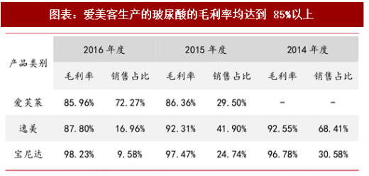 一支玻尿酸的价格,从几百元到上万元不等,其毛利率可以达到多少?以专门生产玻尿酸的爱美客公司为例,这家公司在 2004 年成立,2017 年要 ipo,注册资本9000 万。招股说明书中显示,爱美客 2014 到 2016 的年度营业收入分别为 7512 万、1.1 亿、1.4 亿,2016 年的净利润达到了 5310 万元,比 2015 增长了 200%。公司主要生产爱芙莱、逸美和宝尼达三种玻尿酸,在 2016 年,宝尼达的毛利率达到了98.23%,其他各个产品在三年中的毛利率也都达到了 85%以上。