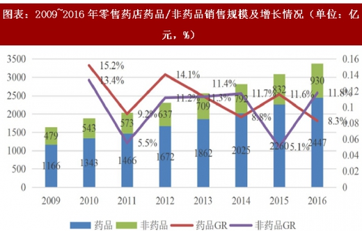 非药品销售规模 930 亿元,同比增长 11.7%,较 2015 年增速(5.1%)扩大近 1.3 倍,再次反超药品增速。