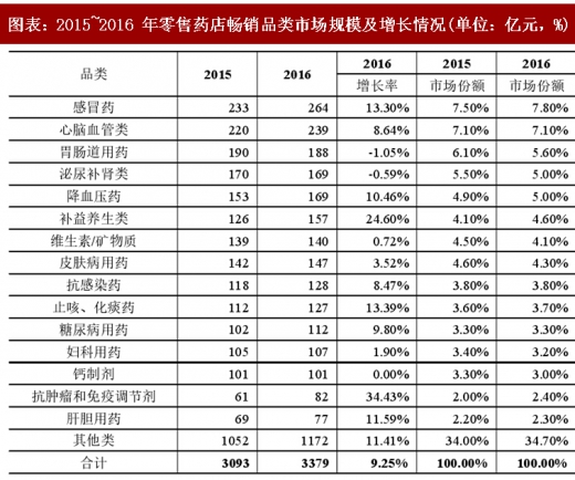从不同药品品种在零售市场的销售表现来看,根据中康 cmh 监测数据显示,2016 年,市场规模超过 100 亿元的细分品类共有 13 个,市场份额合计 60.6%,与 2015 年(61.8%)基本持平。感冒药、心脑血管药和胃肠道用药继续排名前三甲。具体来看,受我国居民常见多发病病种发生变化,抗肿瘤和免疫调节剂增速最快,增长率高达 34.2%,而排名第三的胃肠道用药的市场份额下降明显,从 2015 年的 6.1%下降为 2016 年的 5.6%。此外,受益于居民养生意识和收入水平的提升,补益养生类产品增速(24.1%)仅次于抗肿瘤和免疫调节剂排名第二。预计未来,随着以心脑血管疾病、肿瘤、慢性呼吸道疾病、糖尿病等为代表的慢性病的多发,心脑血管、抗肿瘤和免疫调节类药物的零售市场需求有望进一步增加,随着居民健康管理和自我保健意识的增强,补益养生类产品的零售市场份额有望提升。