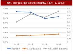 从医药制造业工业增加值来看,根据工业和信息化部公布的数据,2016 年,规模以上医药工业增加值同比增长 10.6%,增速较上年同期提高 0.8 个百分点,高于全国工业整体增速 4.6 个百分点,位居工业全行业前列。医药工业增加值在整体工业增加值中所占比重为3.3%,较上年上升 0.3 个百分点,医药工业对工业经济增长的贡献进一步扩大。