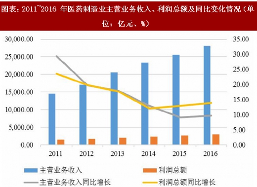 从医药制造业主营业务收入和利润情况来看,2016年,医药制造业主营业务收入同比增长9.70%,增速较上年提高0.60个百分点;利润总额同比增长13.90%,增速较上年提高1.00 个百分点。