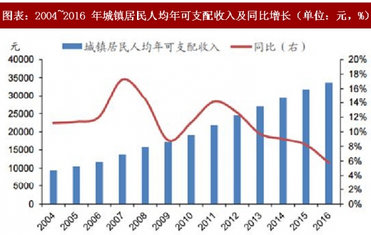 在整体卫生医疗需求提升的同时,收入水平的增加也提升了居民药品消费能力。2003~2016 年,我国城镇居民年人均可支配收入从 8,472 元提高到 33,616 元,复合年均增长率达 11.18%,居民整体消费能力不断增强。