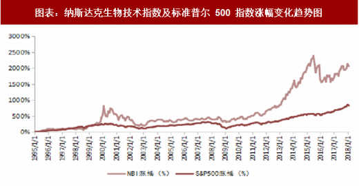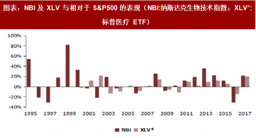 1995 年至 2017 年,nbi(纳斯达克生物技术指数)的涨幅为 2073.7%,远超过同期标准普尔 500 指数的涨幅(819.1%)。在过去 22 年中的 13 年里,nbi(纳斯达克生物技术指数) 涨幅超过标准普尔 500 指数,在过去 18 年中有 12 年超过了 xlv* (标准普尔医疗 etf)。