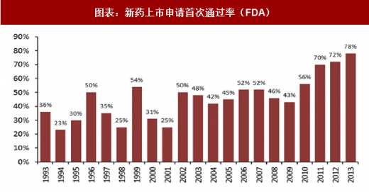 药物研发周期长,风险高。evaluate pharma 最新报告数据显示海外药企研发一种新药需要 40 亿美金,研发周期长达 8-10 年。产品的安全有效性、公司的创新能力、在研项目的数量、产权保护的完备性、生物类似药的问世期限等因素都会影响公司研发管线的估值。政府监管 在市场竞争下,生物技术公司必须在临床试验结果有效的同时确保符合政府监管要求。药品的上市审批速度及成功率影响着生物医药公司的价值实现。在已有的临床试验成果下,公司向监管机构提交上市申请,倘若申请未通过则重新进行药物评估直到符合规定。新药首次通过率并不是一成不变的,从 20 世纪 90 年代以来,美国药品上市申请通过率显著提高,主要源于 fda 的新政以及公司与 fda 间的有效沟通。由此我们可以推断,生物技术公司的研发实力和技术工艺、产品质量等都在不断提高,研发出来的产品能够通过 fda 严格的审批审查制度。同时,我们也认为监管机构加快新药上市的审批速度是充分考虑市场需求的结果,新药快速上市一方面能够促进企业的发展,另一方面也能让更多的患者尽早接受治疗。