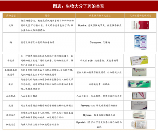 依据化学成分与作用的不同,生物大分子药可按结构、来源和作用等分类,通常包括抗体、酶、干扰素、集落/造血刺激因子、激素、血液制品、疫苗、基因治疗药物和细胞治疗药物等几类。