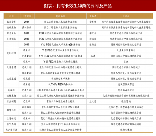 长效重组蛋白作为上一代产品较好的替代产品,具有安全、高效的特点,长效蛋白药在国内的上市也有利于国产药替代进口产品。目前国内拥有上市和在研长效生物药的公司至少有 14 家,产品涵盖了生长激素、干扰素、促红素、粒细胞集落因子、促卵胞素和血管内皮抑制素。平均下来,1 款产品有两家公司生产,假如这些产品全能完成临床试验成功上市,竞争也不会太大。因此这些长效生物药具有较好的市场前景。