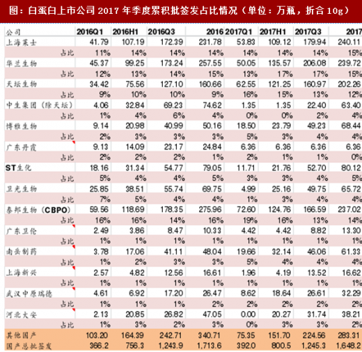 2017年全年白蛋白合计批签发4,027.6万瓶(折合10g),2016年全年批签发量为3642.53万瓶,增速达到2.21%。2017年国产白蛋白批签发占比41%、进口白蛋白批签发占比59%。与2017q3相比进口白蛋白占比略有下降,与2016年相比进口白蛋白占比提升2个百分点。