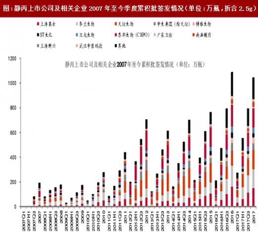 静丙同样是血制品的主要品种和利润来源之一,生产企业较多。采浆量较多的企业静丙批签发量也较多,2017年批签发上海莱士占比14%、华兰生物占比15%、天坛生物(不含三大血制)占比15%、泰邦生物占比15%,四者合计占比接近60%。