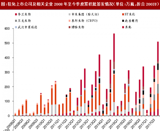特种免疫球蛋白生产的投浆量要求高、生产工艺较为复杂,只有部分血制品企业生产。2017年批签发占比st生化21%、卫光生物13%和泰邦生物19%,非上市公司中四川远大蜀阳占比17%,四家合计批签发占比70%左右。