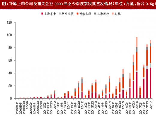 纤原主要由4家企业生产,上海莱士批签发占比53%、华兰生物8%、博雅生物29%和上海新兴6%,合计批签发占比96%,基本上垄断了纤原市场。2017年上海莱士和华兰生物的纤原生产量都大幅上升。