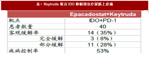ido抑制剂联合抗pd-1单抗有望显著改善尿路上皮癌疗效。ido抑制剂epacadostat联合抗pd-1单抗keytruda治疗肾细胞癌,客观缓解率达到35%,疾病控制率达到53%,有望显著优于抗pd-1单抗单药治疗。
