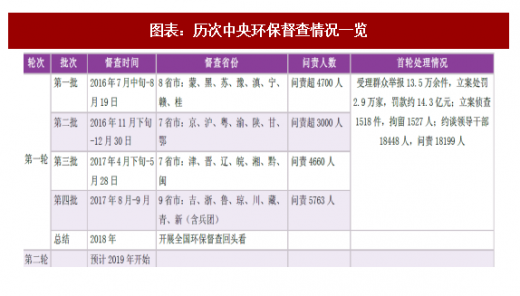 环保政策空前严厉:中央环保督查常态化。自2016年开始,中央共发起组织首轮四批全国环保督查,涉及省市(含兵团)共31个,基本完成为期两年的覆盖全国范围环保督查,期间受理群众举报13.5万余件,立案处罚2.9万家,罚款约14.3亿元;立案侦查1518件,拘留1527人;约谈领导干部18448人,问责18199人,对全国环境保护保持高压态势;2018年,重点组织开展首轮中央环保督察整改情况“回头看”。国家环境保护督察办公室副主任刘长根透露,中央已经明确,每两年左右对全国各省(区、市)要督察一遍,环保部部长李干杰公开表示,目前正在为后续开展第二轮做好准备,研究推进有关中央环保督察相关法规的制定工作。预计2018-2019年,中央环保督察组将在全国范围内开展第二轮中央环保督察,中央环保督察制度将常态化。