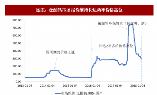 自2015年下半年来,维生素价格整体持续上涨,饲用维生素价格指数迭创新高,去年底达398.9点,创出十年历史高位。本轮维生素价格整体大幅上涨主要源于我国持续收紧的环保政策,叠加期间主要生产企业生产事故等原因。