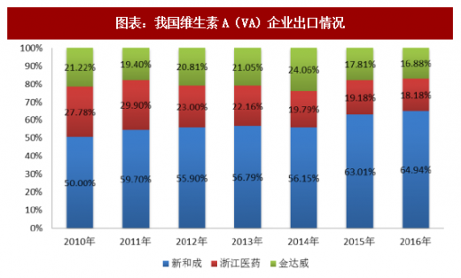 我国va三大生产企业新和成、浙江医药和金达威,新和成近年来出口占比逐年扩大,2016年出口占比65%左右,浙江医药约18%,剩下金达威约占17%。