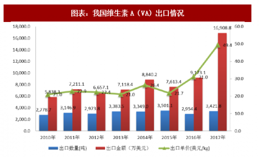 va出口方面,据海关总署数据,2017年我国共出口va3421.8吨(备注:va出口产品种类较多,有va100万va65万va50万等),出口金额1.69亿美元,折合出口单价49.4美元/千克,但从当月出口数据看,第四季度va受basf火灾事故影响,价格上涨明显,今年1月份出口单价突破200美元/kg,达到201.8美元历史高位。从2010年到2017年,年出口数量基本稳定在3000-3500吨,下游需求稳定。