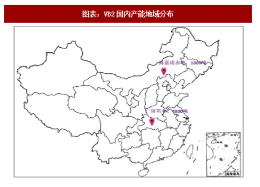 国内vb2主要由广济药业和海嘉诺药业(原迪赛诺)主导,海嘉诺药业旗下内蒙赤峰制药股份有限公司vb2产能约1000吨,另外还有山东恩贝。