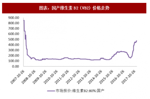 价格回顾:2007年,由于巴斯夫(韩国)工厂罢工停产,vb2价格暴涨,国内vb2市场报价高达850元/千克。此后随着巴斯夫复产,伴随08年美国次贷危机爆发导致全球经济急转直下,vb2价格雪崩至100-150元间,价格低位彷徨持续长达7年之久,波澜不惊。由于玉米占vb2生产成本的50%以上,2009-2014年,我国玉米采取国家收储保护政策,国内玉米及玉米淀粉价格持续上涨并维持高位,vb2生产厂家成本压力巨大,广济药业原料药产品毛利率2012-2014年毛利率仅有7.46%、12.44%和7.57%。2016年国家玉米收储制度改革,采取“市场定价、价补分离”原则,玉米期货价格从2015年第二季度开始大幅下跌,最低跌至1400元/吨水平,跌幅高达45%,广济药业原料药毛利率大幅回升至32%,2016年vb2低位回升,最高市场报价270元/千克,涨幅116%,2017年上半年价格回落到最低155元/kg左右,下半年随着国内严厉的环保督查,维生素掀起大范围涨价潮,vb2提价明显,截止今年3月14日,vb2市场报价440元/千克,同比去年6月上涨1倍有余。
