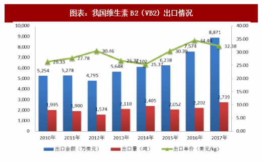 vb2出口方面,2017年我国共出口vb22739吨,折合年均出口单价32.38美元/千克,从同比2016年出口均价有所下滑,主要是上半年出口价格较低,从下半年开始,vb2出口价格随着国内市场报价上升而回升,今年一月份月均出口单价攀升到49.3美元/kg的高位。在出口份额方面,由于2014年海嘉诺旗下赤峰制药的饲料级vb2因涉及转基因事件,被欧盟吊销fami-qs证书,目前广济药业主导国内vb2出口,约占出口份额70%左右。