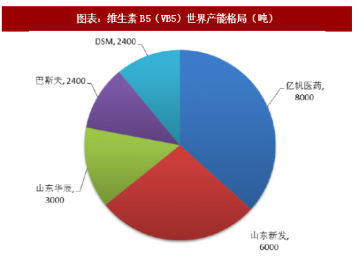 世界vb5市场呈高度寡头垄断格局,全球仅5家生产企业,亿帆医药、山东新发、山东华辰、帝斯曼、巴斯夫等五家。亿帆医药是vb5(泛酸钙)龙头,vb5产能为8000吨左右,占全球总产能40%左右,山东新发6000吨左右,山东华辰3000吨左右,巴斯夫和dsm产能均在2400吨左右。另国内还有兄弟科技(002562)一期5000吨vb5产能目前待投产;