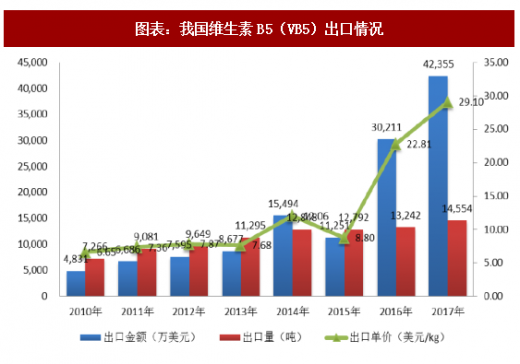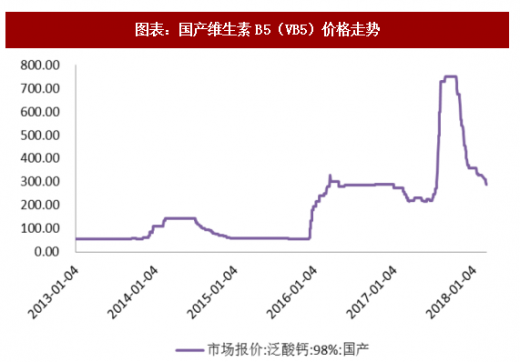 价格回顾:2008年-2015年,vb5价格长期在55元/千克附近窄幅波动,期间即使有波动,也维持时间较短,从2015年底以来,由于环保因素山东新发(产能占30%)vb5生产线停产整改,导致vb5供货紧张,价格快速攀升至300元/千克大关;2017年上半年,小幅回落至220元/千克价格水平;7月,由于山东环保督查,泛酸钙(vb5)行业第二、三大厂商山东新发和山东华辰停产,亿帆医药浙江也部分装置停产检修,占vb5世界总产能85%的三巨头同时因环保产能收缩,vb5市场报价飙涨至9月的750元/千克水平,此后随着山东企业复产,vb5价格回落到两年历史均价区间,最新市场报价是280元/kg。
