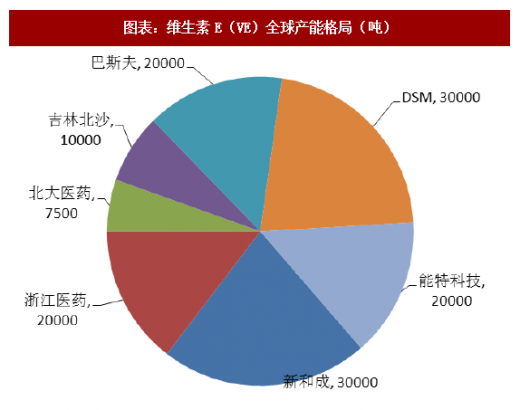 以50%粉计,全球ve市场由dsm(30000吨)、bsf(20000吨)、新和成(30000吨)和浙江医药(20000吨)四大寡头垄断,竞争格局稳定,cr4产能占比超70%;另外北大医药旗下西南合成有7500吨ve产能,但由于生产成本较高,自2015年开始逐渐停产;近年来,吉林北沙制药2014年新增9000吨ve产能技改,产能提升到10000吨,冠福股份旗下能特科技于2016年8月份投资5.7亿元建设年产20000吨维生素e项目,2017年3月份开始正式投产对外销售,全球产能提升约30%。目前,全球ve全部总产能约13.75万吨。