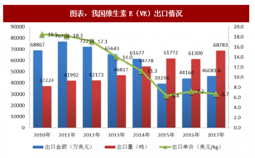 我国ve出口较大,据海关总署披露数据,2017年ve出口量6.87万吨,占当年我国ve总产能的80%以上,但从2010年以来,出口价格持续下滑,近3年维持6.4-7.2美元/kg历史低位。自去年11月开始,受basf德国工厂爆炸影响,ve国内市场报价和国际出口价格同步上扬,双双上涨约一倍,今年1月ve出口均价达12.3美元/kg。