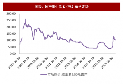 价格回顾:2003年以前,由于dsm和basf扩产,ve呈现供大于求的行业格局,随着需求的自然增长,2007年ve市场供需趋于平衡。2008年,外购中间体生产ve的安迪苏由于成本过高宣布退出ve市场,ve价格狂飙触及260元/公斤价格,之后呈现长期下跌趋势,2015年价格触及40元水平,受杭州g20峰会影响,浙江新和成和浙江医药停产,短期呈现一波上涨走势,随后重回价格低点。2017年10月,basf德国工厂爆炸事故,影响ve全球供应,国内ve市场报价持续上涨,目前最新报价约102元/kg,比去年10月份上涨约一倍。