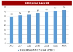 是将超声检测技术应用于人体,通过测量了解生理或组织结构的数据和形态,以发现疾病,并作出提示的一种诊断方法,是一种无创、无痛、方便、直观有效的检查手段。近年来,全球医用超声诊断设备市场稳步发展,据统计,2015 年全球医用超声诊断设备市场规模已达64 亿美元左右,预计2019 年,规模将达74 亿美元,如下图所示: