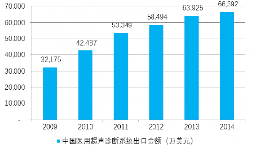 我国医用超声诊断系统企业在稳步提升国内市场份额的同时,也在不断开拓国际市场。2014 年,我国超声诊断设备出口规模已达 6.6 亿美元,2009-2014年均复合增长率达 15.6%,如下图所示: