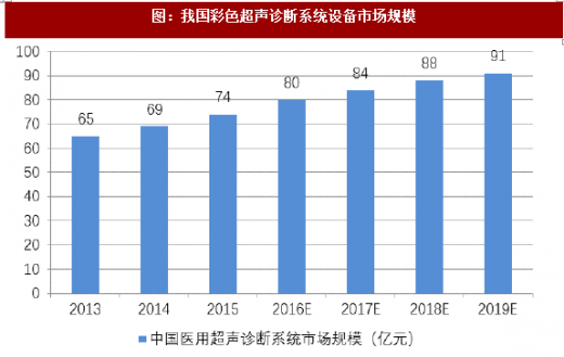 我国超声诊断系统行业起步较晚,但经过多年的发展,目前已初步形成了专业门类齐全、产业链条完善、产业基础雄厚的产业体系。我国已成为继美国、日本之后的世界第三大彩色超声诊断系统市场。2015 年,我国彩色超声诊断系统设备市场已达74 亿元,预计 2019 年,规模将达 91 亿元,如下图所示:
