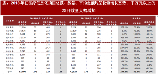 从2017 年第四季度开始,医疗信息化行业增长开始提速,2018 年初的项目金额实现高速增长。(1)各公司已披露的业绩情况可以看出,2017 年第四季度卫宁健康、创业软件、和仁科技、久远银海等公司的收入增长已开始加速。而一般医院信息化项目的实施周期为3~6 个月,卫宁健康、创业软件等披露的2018 年一季度高增长的业绩预告,可以进一步证实行业景气度从2017 年第四季度开始的上升趋势。(2)我们梳理了各家公司今年1 月1 日至3 月16 日的项目中标情况,可以发现项目中标总金额同比增长104.8%,项目数量同比增长52.8%,说明今年一季度行业需求继续升温,优质产品公司2018 年的业绩有望实现高速增长。