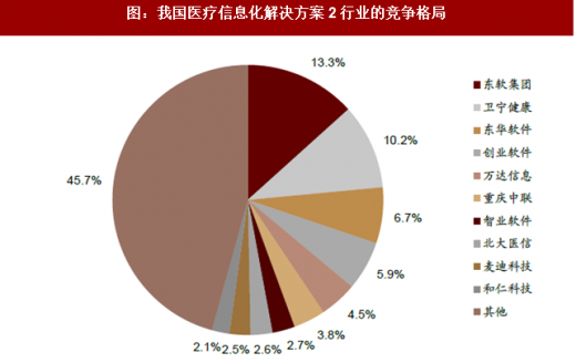 目前医院与区域卫生信息化的市场竞争格局是,东软集团、卫宁健康、东华软件、创业软件、万达信息共同组成了行业第一梯队。根据数据,东软集团的市场份额为13.3%,位列行业第一名,而卫宁健康等公司紧随其后;行业第6~10 名的公司中,仅麦迪科技、和仁科技登录了a 股市场,而北大医信注入方正科技的承诺延期,智业软件ipo 被否,重庆中联暂未申请ipo。在各细分市场中,东软集团、嘉和美康、卫宁健康分别占据pacs、emr 和互联网医疗市场的龙头地位。