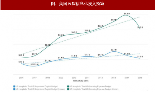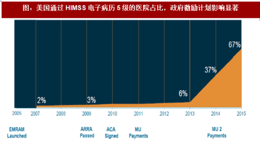 政府的系列法案持续推动医疗信息化行业发展,奥巴马医改后建设力度进一步加大。2004年,美国总统布什发布总统令,明确要求10 年内在全美实现电子病历;2009 年,美国总统奥巴马发布总统令,将医疗信息化作为美国医疗改革的一部分;2010 年美国通过了奥巴马医改,该法案对传统医保支付制度有两方面的革新:其一,增加基于质量表现的奖惩制度,基于价值的购买包含三个质量评估项目,可以影响医院公共医保住院收入的6%;其二,推出两种新的支付模式——①捆绑支付模式,医院要对患者出院后一段时间内的质量和费用负责;②责任制医疗机构(aco),医院要对所属患者一年内的医疗质量和费用负责。因此,医疗机构需要对患者的健康进行有质量的全程管理,从而加大了对信息化产品的需求,如数据整合平台、综合健康档案、疾病风险预测与患者管理路径设计工具等。