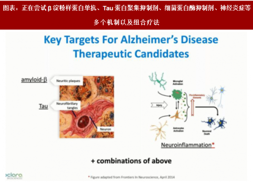 然而,我们有理由相信,未来10年内,阿兹海默症新药有望获得突破。研究人员正在尝试β淀粉样蛋白单抗药物、tau蛋白聚集抑制剂、细菌蛋白酶抑制剂、neuroinflammation等多个机制以及组合疗法。目前全球有198项临床试验,其中3期临床试验37项(皆为小分子),2期107项(100个小分子和7个生物药),1期54项(46个小分子和8个生物药)。β淀粉样蛋白单抗药物是最早开始研究也是失败最多的方向,但并非完全没有希望。虽然针对有症状患者的阻挡β淀粉样蛋白生成的试验,已被证明无效,但针对无症状患者的阻挡β淀粉样蛋白的试验,以及移除或减少β淀粉样蛋白的试验还在进行中。tau蛋白聚集抑制剂和neuroinflammation是近期新兴的思路,有多项早期试验正在进行。组合疗法中,将β淀粉样蛋白单抗药物与tau蛋白聚集抑制剂联用,目前看来最有希望。