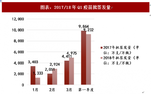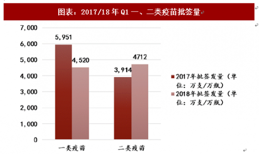 1. 2018年第一季度疫苗市场较2017年第一季度疫苗市场疲软,但二类疫苗批签发量同比增加