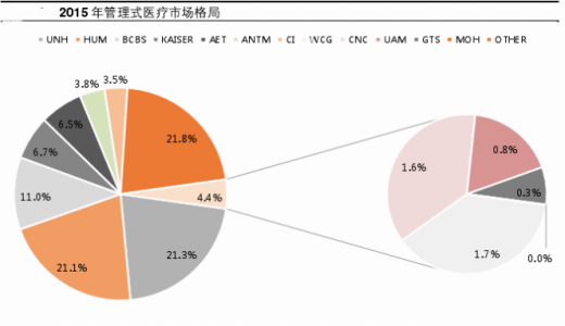 管理式医疗市场集中度高。除最早进入管理式医疗的凯撒医疗集团(kaiser permanente)和非营利性的蓝十字和蓝盾(blue cross blue shield,bcbs)之外,2015 年分别占据 6.7%和 11%的市场份额,美国前 5 大商业健康险公司 united health、humana、aetna、anthem、cigna 均发展管理式医疗业务,2015 年市场份额分别为 21.3%、21.1%、6.5%、3.8%、3.5%,前 7 大管理式医疗组织的市场份额为 73.8%,市场集中度非常高。