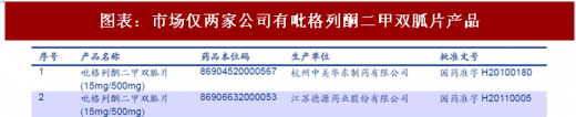 公司的主要产品瑞彤,其通用名为盐酸吡格列酮片。复瑞彤为瑞彤的复方制剂,其通用名为吡格列酮二甲双胍片。相比瑞彤,复瑞彤更具特色,且增速更好,故我们先开始介绍复瑞彤,其次再介绍瑞彤、二甲双胍缓释片。cfda数据显示目前市场上仅两家公司有吡格列酮二甲双胍片(复方产品):分别为中美华东、德源药业。