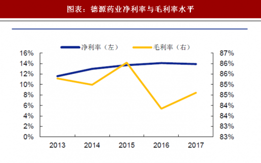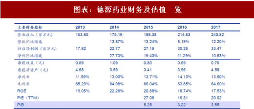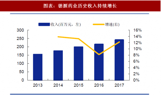 公司是稳健增长型仿企业:公司历史业绩稳健,收入增速长期维持在10%~15%,利润增速长期维持在10%~30%。2017年德源药业实现销售收入2.4亿元,同比增长12.20%;实现净利润3347.47万元,同比增长10.63%,实现扣非净利润3040.39万元,同比增长18.63%。
