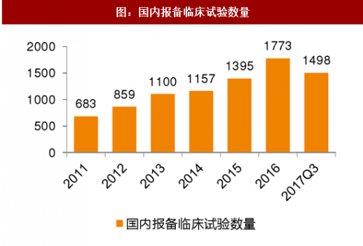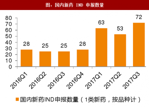 随着产业投入的逐步增加和药政改革的快速推进,创新药供给端已经出现了快速增长的苗头。从创新药产品申报的数量和临床试验开展的数量我们可以看出,2017 年前三季度国内新药 ind 申报数量较同期增长均超过 100%,有关数据统计显示,2017 年前三季度国内在网站上报备的临床试验数量已经超过 2015 年全年报备数量,这两个数据充分显示了创新药产业在供给端的储备正在迅速充沛。我们认为,随着临床试验机构 gcp 备案制等相关实施细则落地,监管层面的瓶颈进一步消除,创新药的供给无论从上市时间周期还是上市品种数量,将都会有更加明显的改善,从而更好的满足临床需求。
