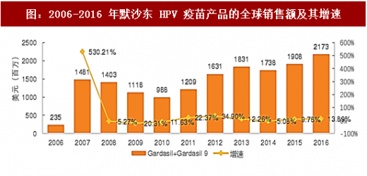 hpv 疫苗在全世界畅销疫苗排行中处于第二,每年销售额在 20 亿美金以上,单 gardasil 这一疫苗品种,自 2006 年上市后累计给默沙东带来超过 130 亿美元的收入。2016 年默沙东的 hpv 疫苗产品 gardasil 及 gardasil 9 的全球销售额为 21.73 亿美元,同比增长 13.89%。